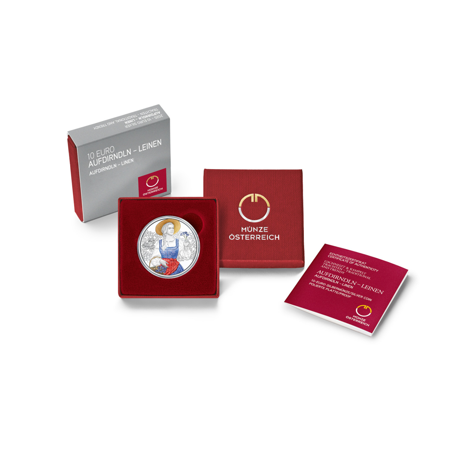Die erste Münze der vierteilige Serie ""Gschneizt & Kampelt"" der Münze Österreich ist da. Beschenken Sie einen Münzliebhaber oder starten Sie selbst eine aufregende Reise durch Österreichs Tradition und Kultur. Die 10 Euromünze ""Aufdirndln - Leinen"" ist aus Silber 925 Sterling gefertigt und begeistert in der besonderen Prägequalität „Polierte Platte“. Die bunte Münze ist eine Hommage an die österreichische Trachtenkultur und ein MUST Have für alle Liebhaber des Dirndls.