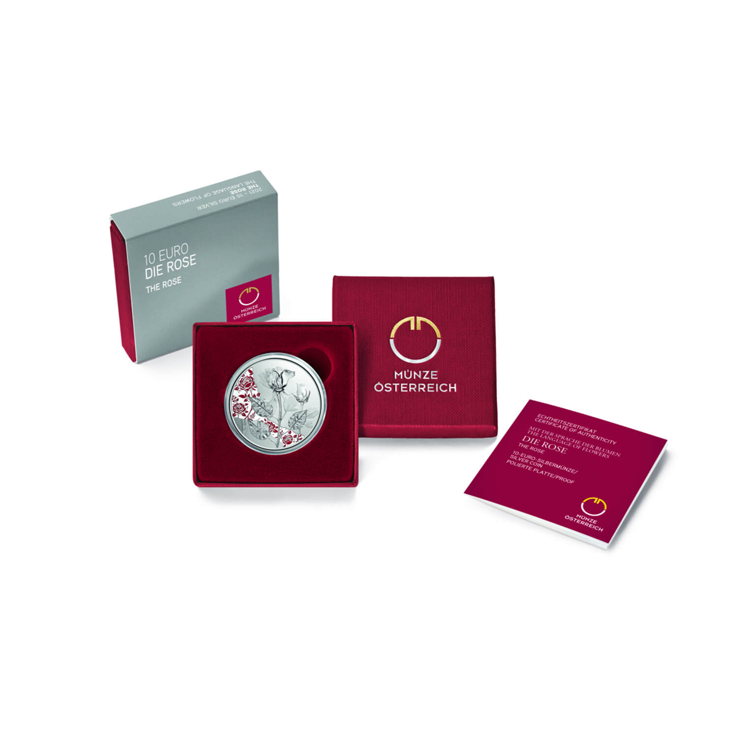 Die Wertseite der ersten Münze aus der neuen Serie „Mit der Sprache der Blumen“ zeigt ein liebendes Paar und stammt aus der renommierten Kollektion Münze Österreich. Beide tragen Blumen im Haar und schauen sich innig in die Augen. Auf der anderen Seite sind zwei Rosen zu sehen, das Symbol leidenschaftlicher Liebe. Im Hintergrund ist ein Band mit einem stilisierten Rosenornament abgebildet, das mit einem Farbdruck veredelt ist. Bei den Rosen handelt es sich um Abdrücke echter Blumen. So gleichen die Pflanzen ihren realen Vorbildern bis ins kleinste Detail.