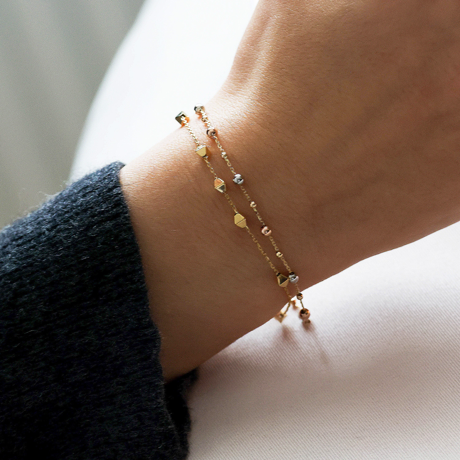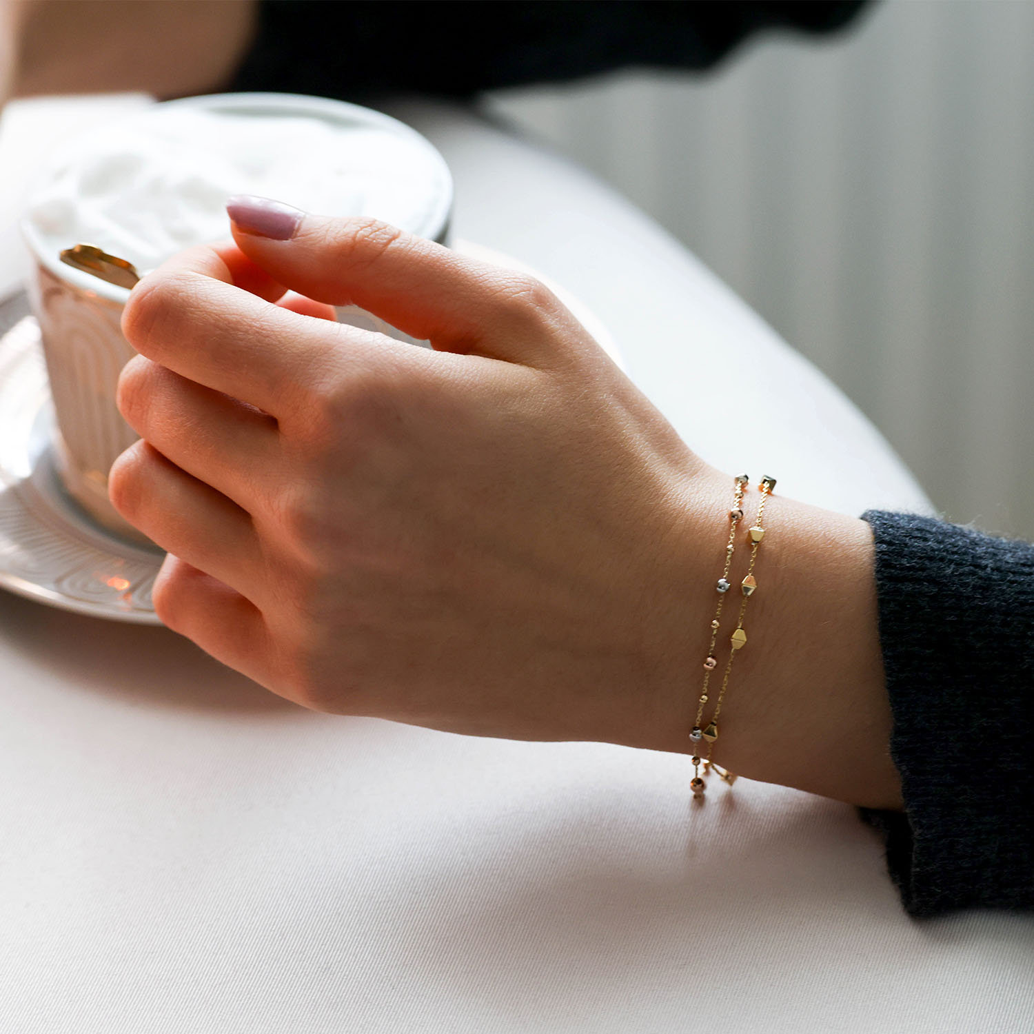 Ob zum nächsten Abendkleid oder im Alltag zu Jeans und T-Shirt, diese Armkette passt wirklich immer. Das Armband aus unserer "shine" Kollektion ist aus 585/- Weißgold, Gelbgold und Roségold gefertigt. Besonderes Highlight sind im Licht schimmernde Kügelchen und eine Zwischenöse bei 17cm.