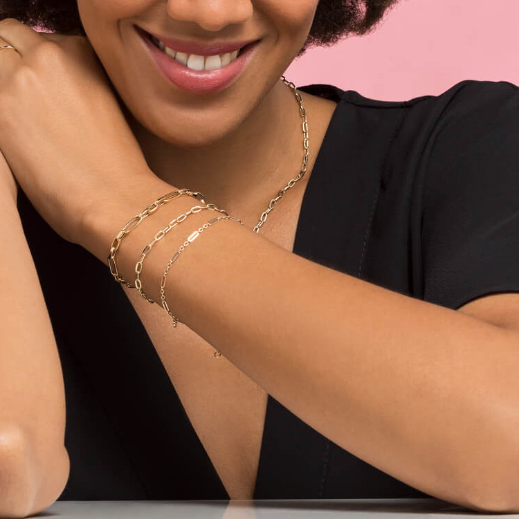 Diese wunderschöne Armkette aus der Shine Kollektion ist aus 585/- Gold gefertigt. Der angesagte "paper clip" Stil besteht aus vielen ineinander verhakten Rechtecken die zusammen ein traumhaft klassisches-modernes Schmuckstück ergeben.