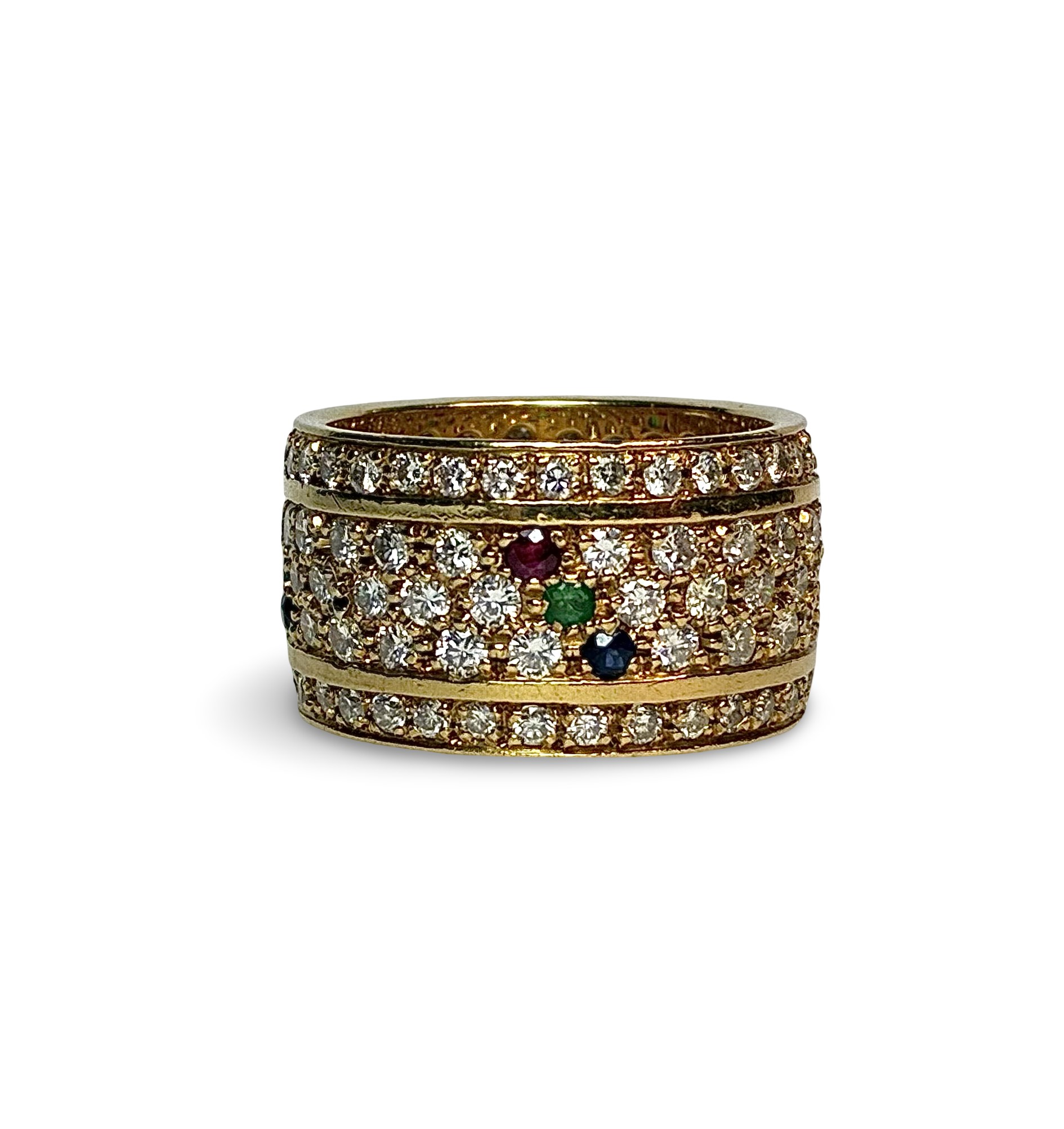 Besatz: Brillanten zus. ( 3,06ct, H-I/Si-P), Rubine Saphire und Smaragde zus. ( 0,48ct) Steingewichte graviert