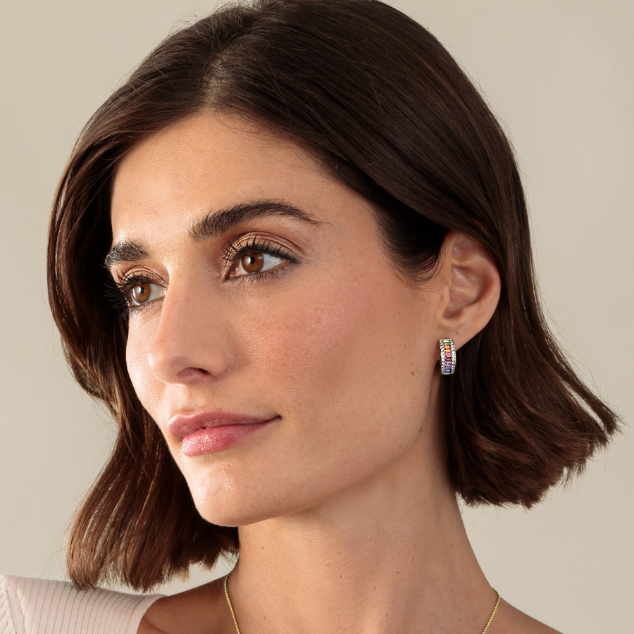 Entdecken Sie die praktischen Klappcreolen "Rainbow" aus 585/- Gold mit Brillanten ca. 0.33 ct., H Weiß / p1 und bunten Schmucksteinen (Granat, Citrin, Peridot, Topas, Amethyst). Diese luxuriösen Ohrringe sind ein Blickfang für jeden Anlass.
