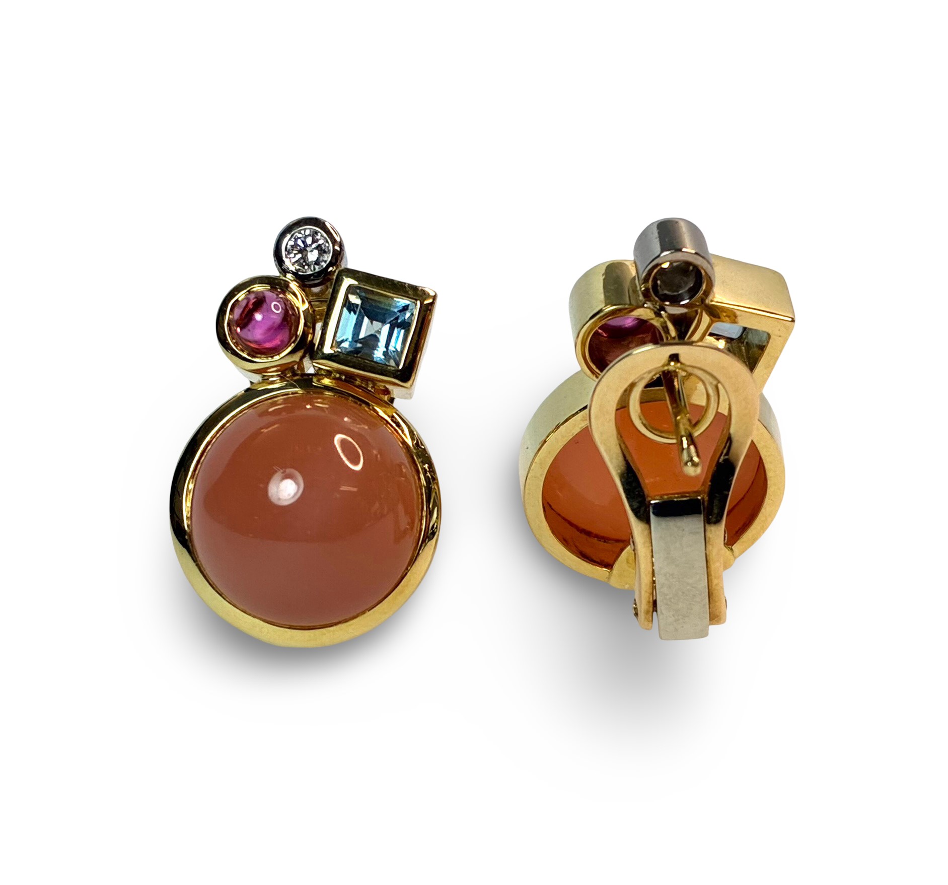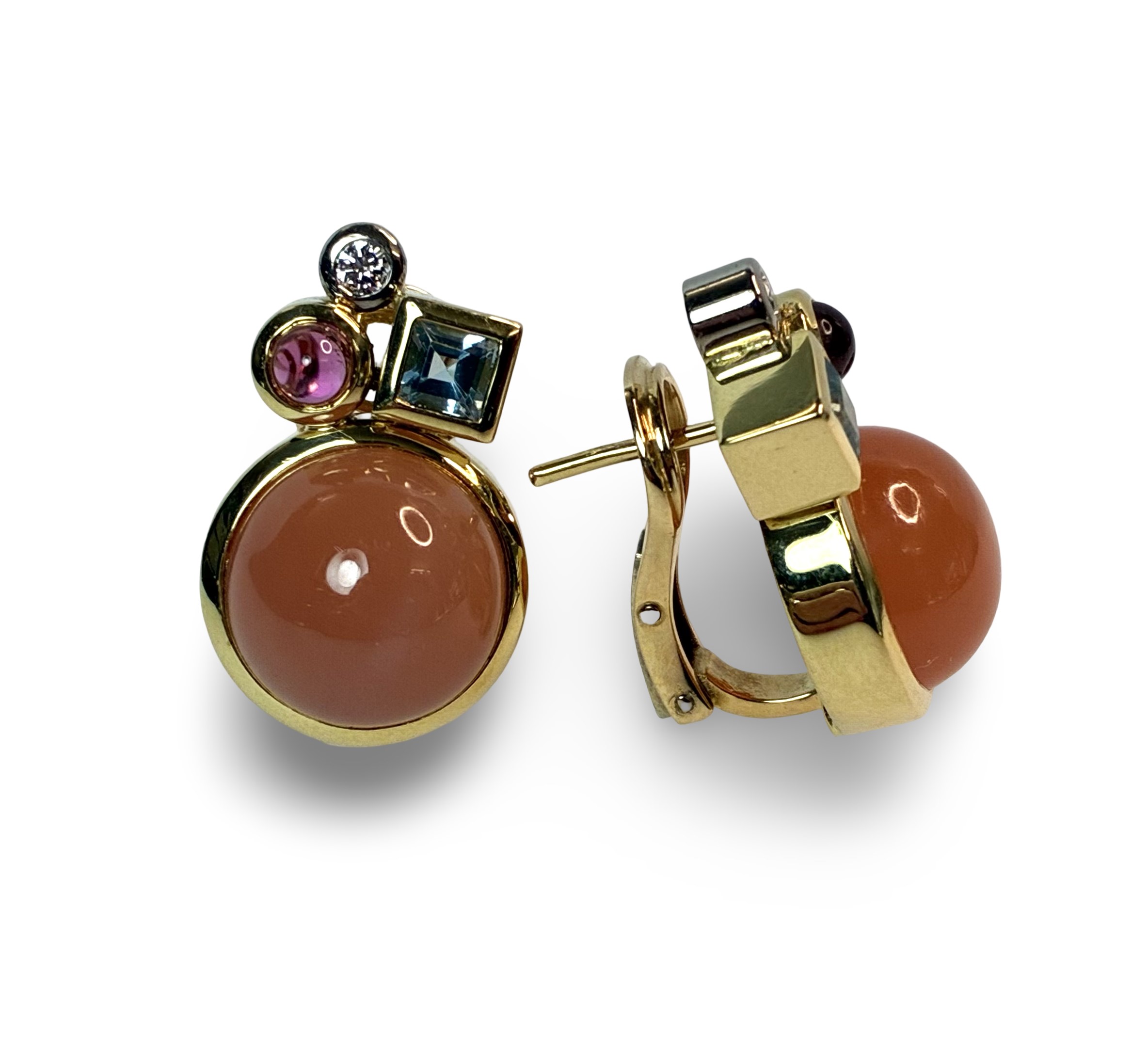 Besatz: Mondstein u. Rubellit im Cabochonschliff je ein Topas im Carreeschliff, je ein Brillant zus. ( 0,14ct, I/Si, (grav))