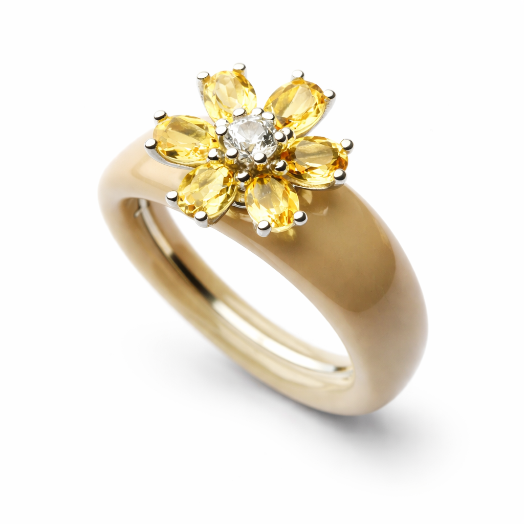 Der elegante Charlotte Kopf KRISTALL BLÜTE aus 925/- Sterlingsilber mit einem Durchmesser von 15 mm begeistert durch seine filigrane Gestaltung und zeitlose Ausstrahlung. Die zarte Blütenform ist mit einem weißen Saphir im Zentrum und funkelnden Citrinen verziert, die ihr ein edles, lebendiges Strahlen verleihen. Ein harmonisches Zusammenspiel aus Leichtigkeit und Raffinesse – ein bezauberndes Köpfchen, das Persönlichkeit unterstreicht und jedem Look eine feminine, stilvolle Note verleiht.