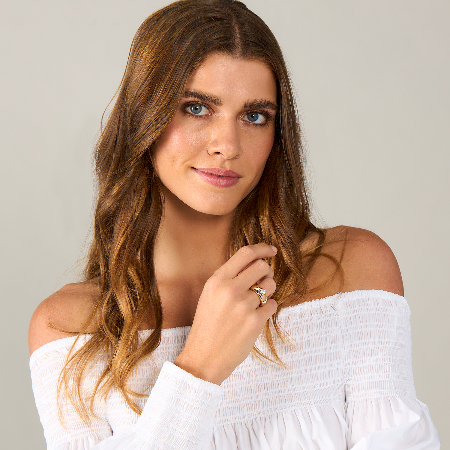 Der Charlotte Touch Ring aus edlem, poliertem 585/- Gelbgold vereint klassische Handwerkskunst mit moderner Eleganz. Sein sanft konisches Profil und eine Breite von ca. 8 mm verleihen ihm eine harmonische, ausgewogene Form und ein angenehmes Tragegefühl. Die polierte Oberfläche des Goldes lässt das warme Leuchten des Edelmetalls besonders strahlend zur Geltung kommen und verleiht dem Ring eine luxuriöse, zeitlose Ausstrahlung. Vollendet wird das Design durch ein Dömchen aus weißem Perlmutt, dessen zarter Schimmer dem Gold eine feine, edle Note verleiht und das Gesamtbild stilvoll abrundet.