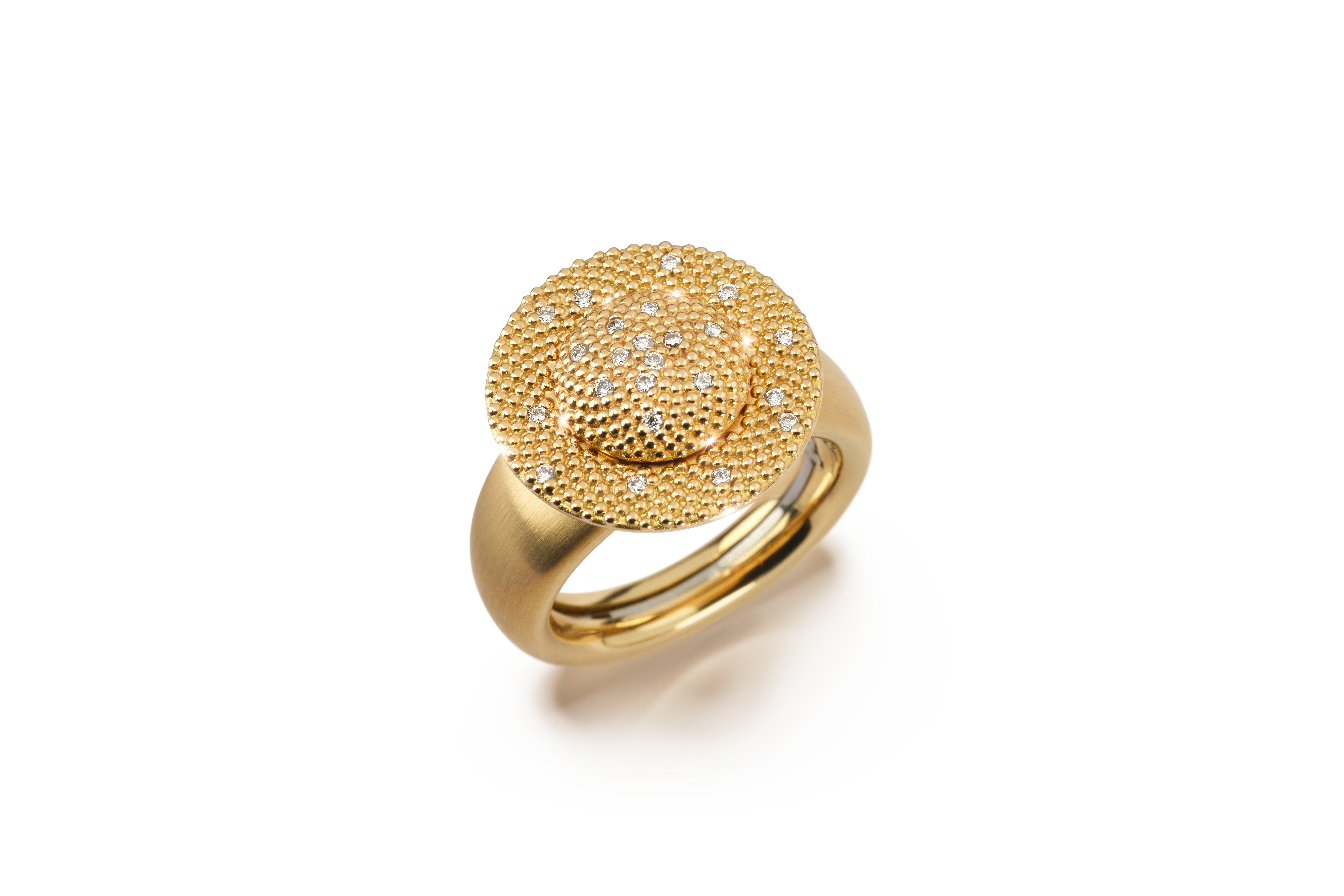 Der Charlotte Touch Ring aus edlem, mattiertem 585/- Gelbgold vereint klassische Handwerkskunst mit moderner Eleganz. Sein sanft konisches Profil und eine Breite von ca. 8 mm verleihen ihm eine harmonische, ausgewogene Form und ein angenehmes Tragegefühl. Die matte Oberfläche des Goldes unterstreicht den zeitlosen Charakter des Rings und lässt das warme Leuchten des Edelmetalls besonders stilvoll zur Geltung kommen. Vollendet wird das Design durch ein Dömchen aus weißem Perlmutt, dessen zarter Schimmer dem Gold eine feine, luxuriöse Note verleiht und das Gesamtbild elegant abrundet.