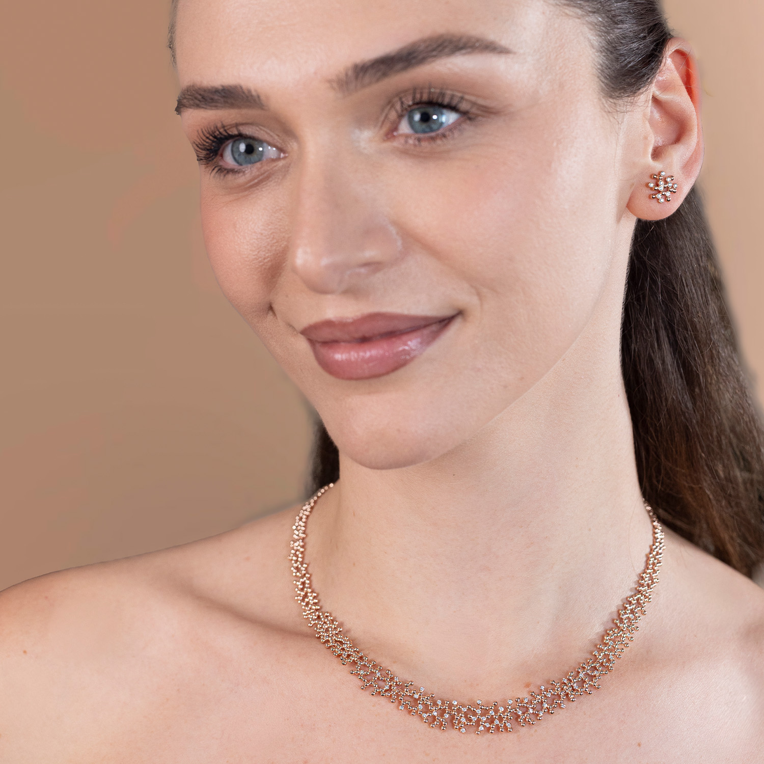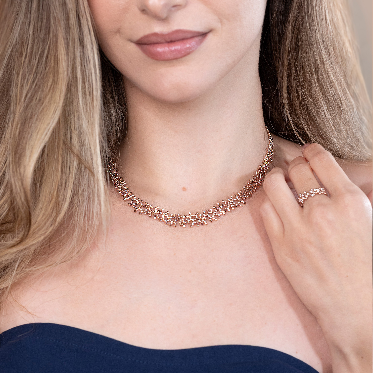 Das AURELIA Collier aus 585/- Rotgold vereint auf raffinierte Weise Wärme, Eleganz und strahlende Silhouetten. Die 49 funkelnden Brillanten (insgesamt 0,38 ct. TWvsi) sind meisterhaft eingefasst und bringen edlen Glanz, intensives Feuer sowie zarte Lichtreflexe, ohne aufdringlich zu wirken. Das 43 cm lange Collier umschmeichelt den Hals mit einer edlen Silhouette und verleiht ein leichtes, luxuriöses Tragegefühl. Es lässt sich mühelos in jedes Outfit integrieren – perfekt für den Tag sowie für den Abend. Ein Schmuckstück, das zeitlose Schönheit, wertvolle Handwerkskunst und außergewöhnliche Eleganz miteinander vereint.