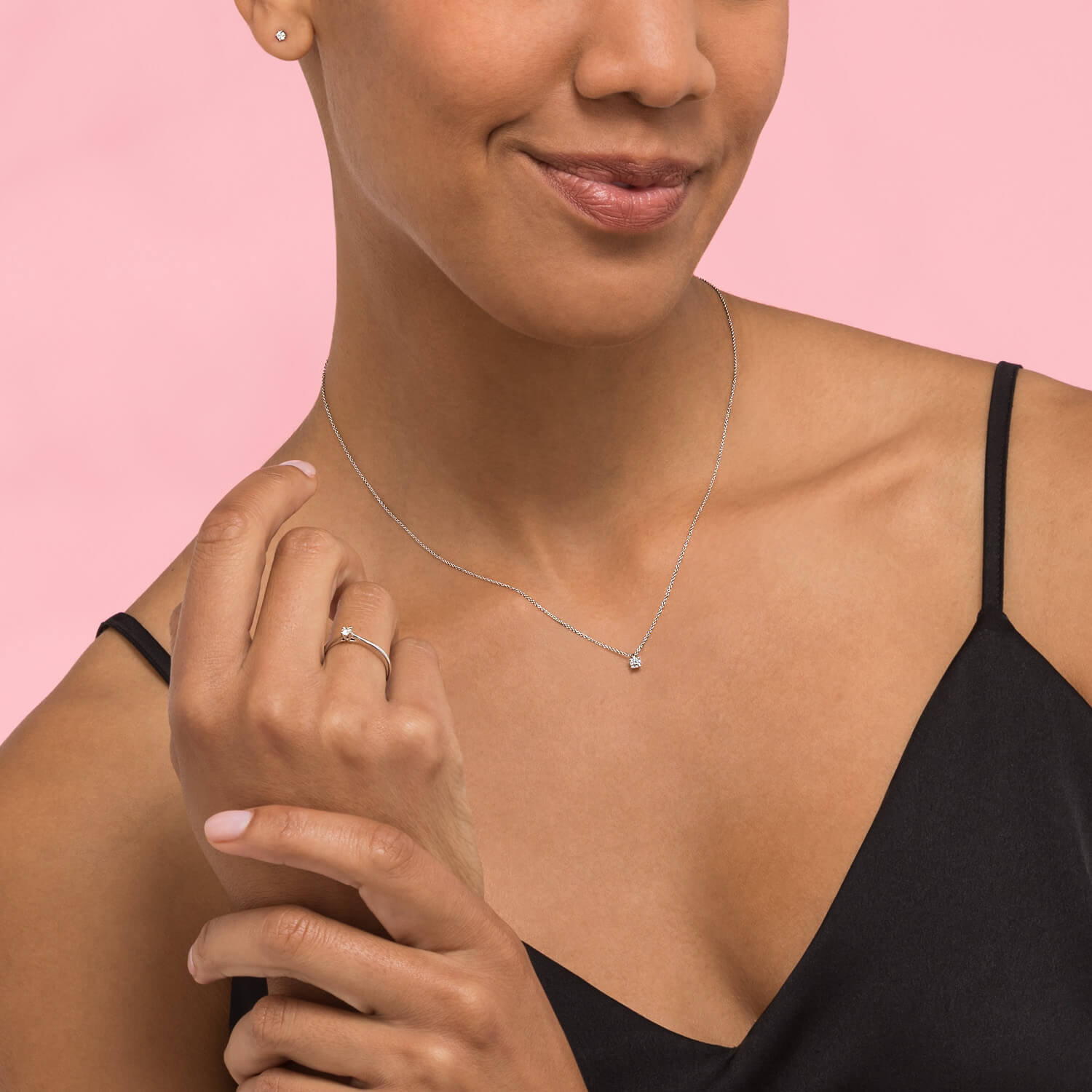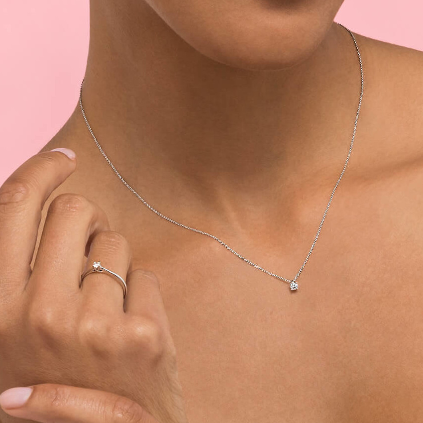 Dieses klassische Diamant Collier ist aus 585/- Weißgold gefertigt und ein wunderschönes Geschenk für Ihre Liebste. Der Diamant im Brillantschliff (ca. 0,10 ct.) sorgt dank der sehr guten Qualität (Farbe: G-H Feines weiß bis weiß, Reinheit: si) für ein unwiderstehliches Funkeln am Dekolleté. Auf der Halskette sind zwei Zwischenösen bei ca. 40 und 42cm montiert. Durchmesser Anhänger: ca. 3mm. Dieser Artikel wurde nachhaltig unter Einhaltung des Code of Practice (CoP) Standards des Responsible Jewellery Council (RJC) zertifiziert gefertigt,