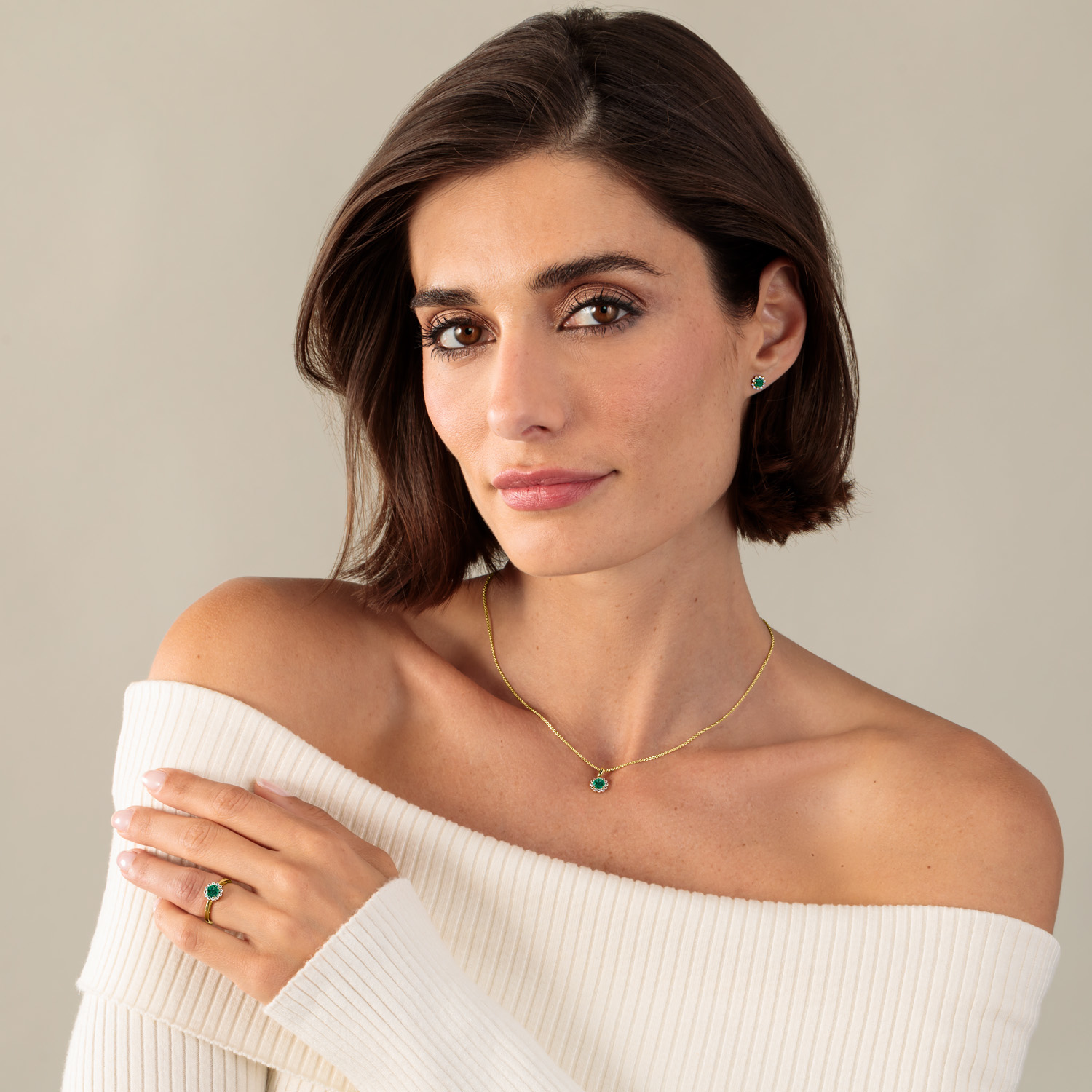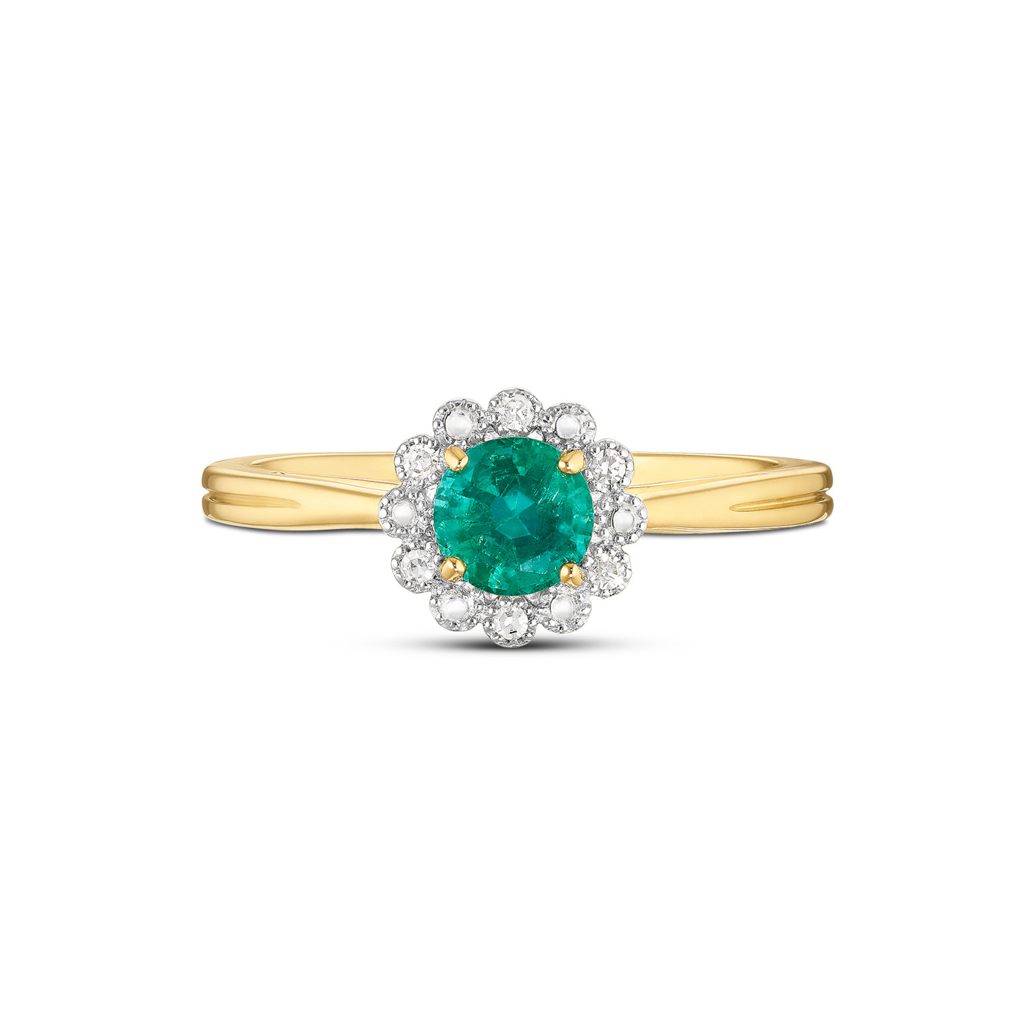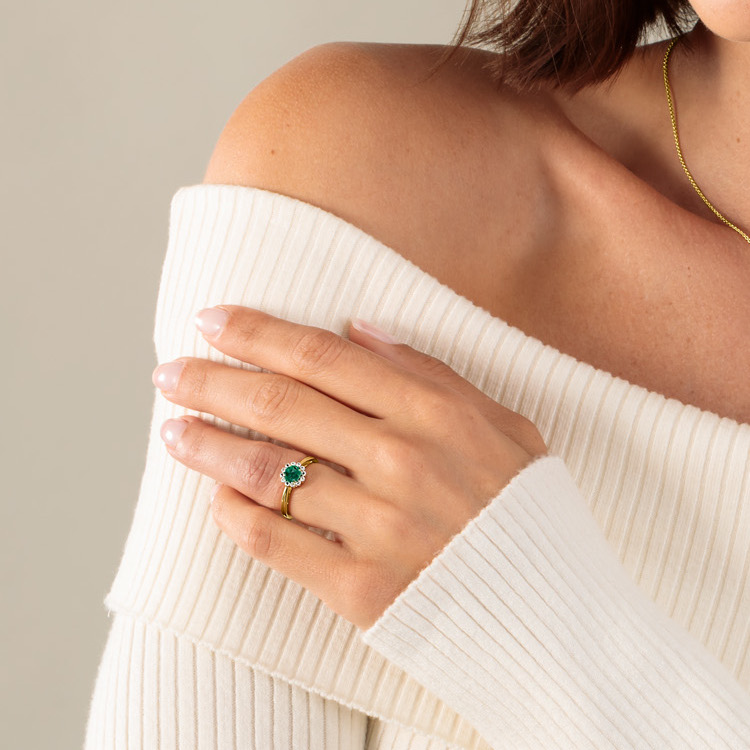 Dieser raffinierte Ring vereint klassische Eleganz mit einem Hauch von Farbe. Gefertigt aus Gold 585 und verziert mit funkelnden Diamanten (zusammen ca. 0,03 ct., Farbe: H Weiß / Reinheit: p1), zieht er alle Blicke auf sich. Der leuchtende Smaragd setzt einen lebendigen Akzent und verleiht dem Halo Ring eine besondere Ausstrahlung. Produziert nach den hohen Standards des RJC/COP, garantiert dieses Schmuckstück nicht nur hervorragende Qualität, sondern auch eine umweltbewusste und ethisch verantwortungsvolle Herstellung. Ein Ring, der Stil und Nachhaltigkeit perfekt miteinander verbindet.