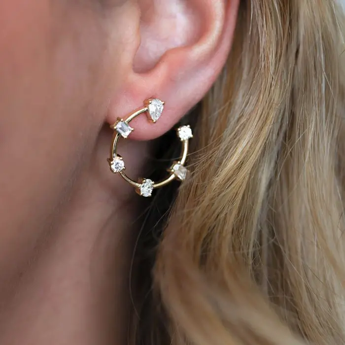 Diese exklusiven Creolen aus Gold 585 sind mit Lab Grown Diamonds in verschiedenen Schliffarten – Brillant-, Smaragd-, Ovalschliff und Tropfenschliff – besetzt. Mit einem Gesamtgewicht von ca. 1,81 ct. und synthetischen Diamanten in feinem F-G Farbton und hoher Reinheit (vsi) strahlen sie luxuriösen Glanz aus. Ein außergewöhnliches Schmuckstück mit funkelnden Labor Diamanten, welches sich perfekt als Geschenk für Ihre Liebste eignet.