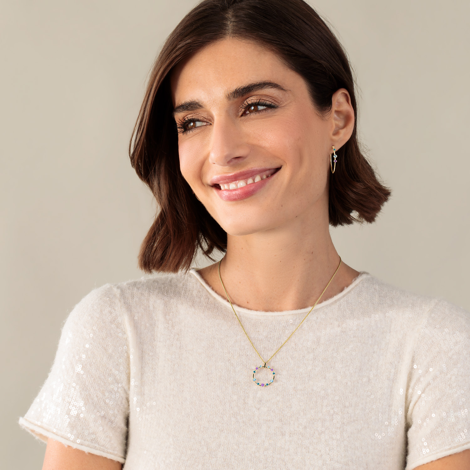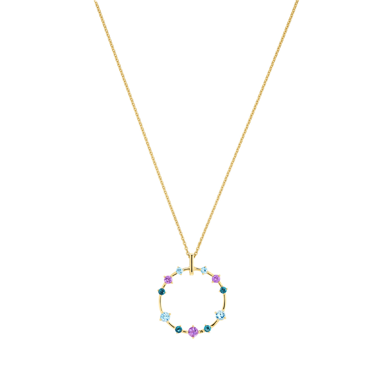 Der kreisförmige Anhänger aus der "Mon Palais"-Kollektion, gefertigt aus 585/- Gold, besticht durch behandelte Topase und leuchtende Amethyste. Kombinieren Sie ihn mit den passenden Ohrringen und einer unserer Basic-Halsketten für ein stilvolles Ensemble. Ein elegantes Schmuckstück, das jedem Outfit einen Hauch von Luxus verleiht. Dieser Artikel wurde nachhaltig unter Einhaltung des Code of Practice (CoP) Standards des Responsible Jewellery Council (RJC) zertifiziert gefertigt.