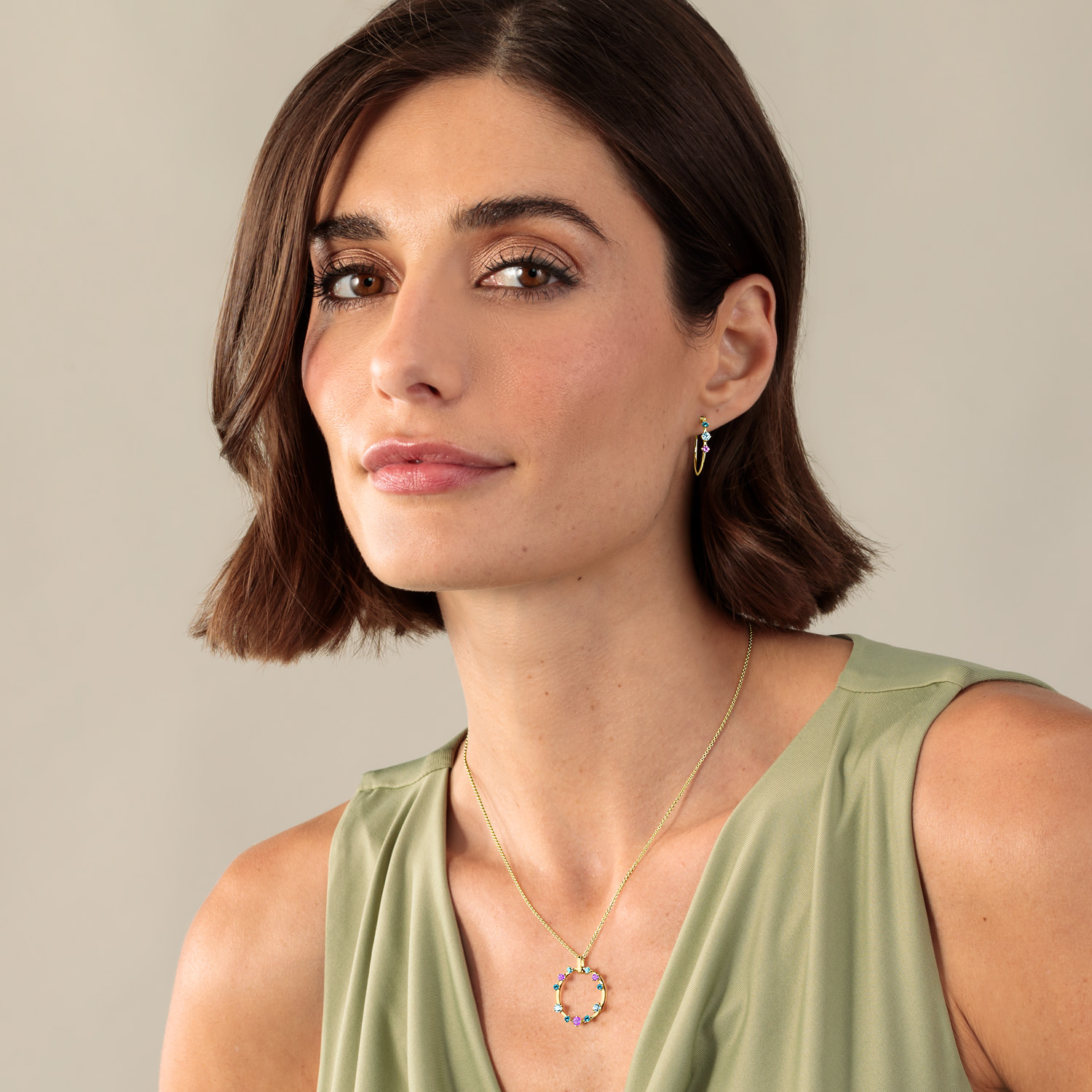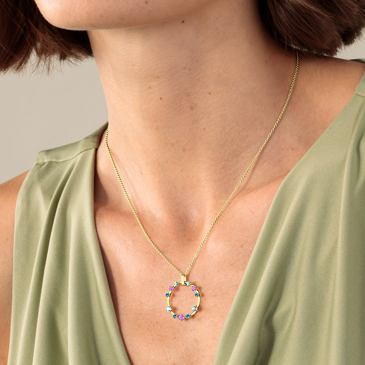 Der kreisförmige Anhänger aus der "Mon Palais"-Kollektion, gefertigt aus 585/- Gold, besticht durch behandelte Topase und leuchtende Amethyste. Kombinieren Sie ihn mit den passenden Ohrringen und einer unserer Basic-Halsketten für ein stilvolles Ensemble. Ein elegantes Schmuckstück, das jedem Outfit einen Hauch von Luxus verleiht.
