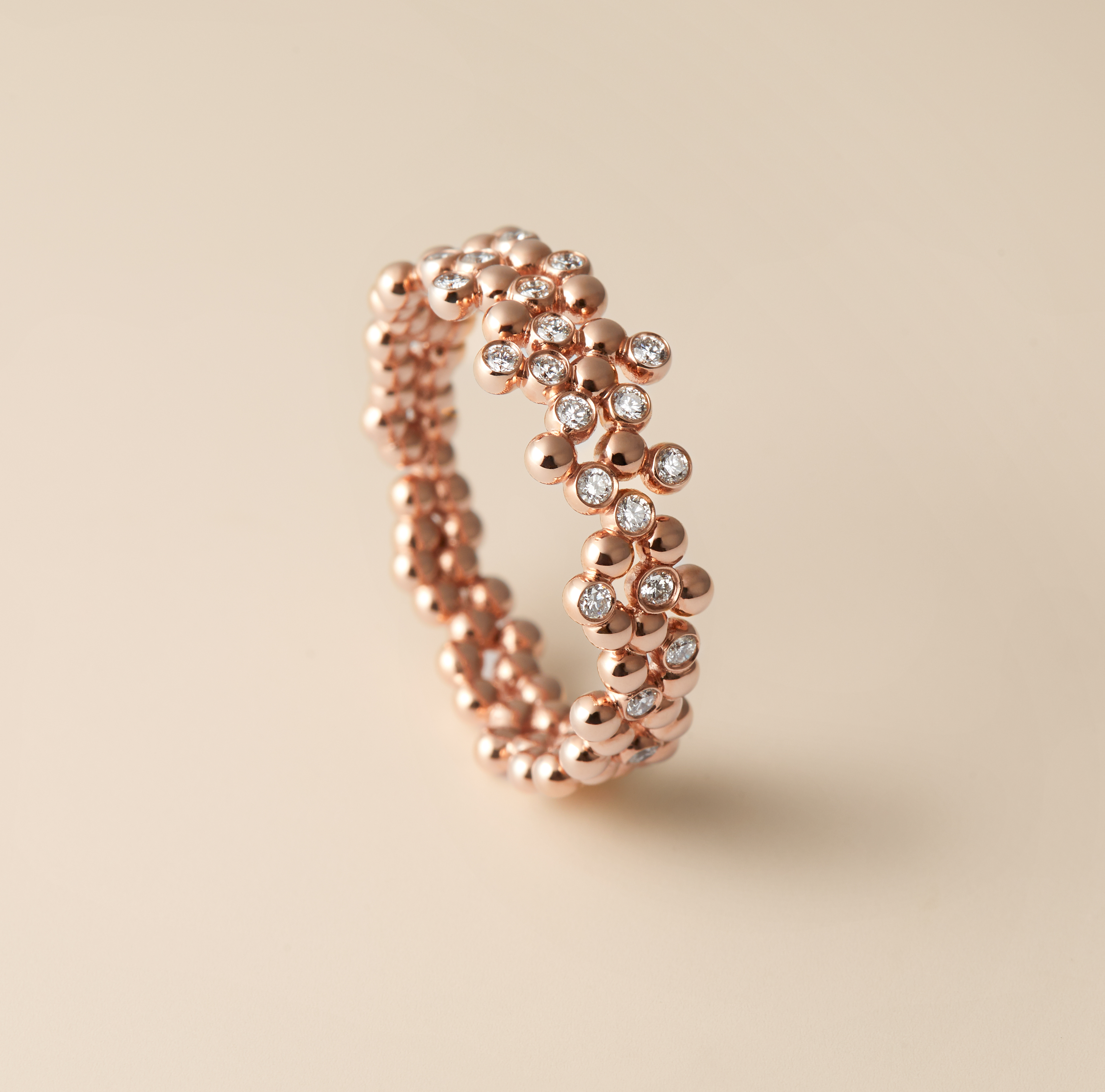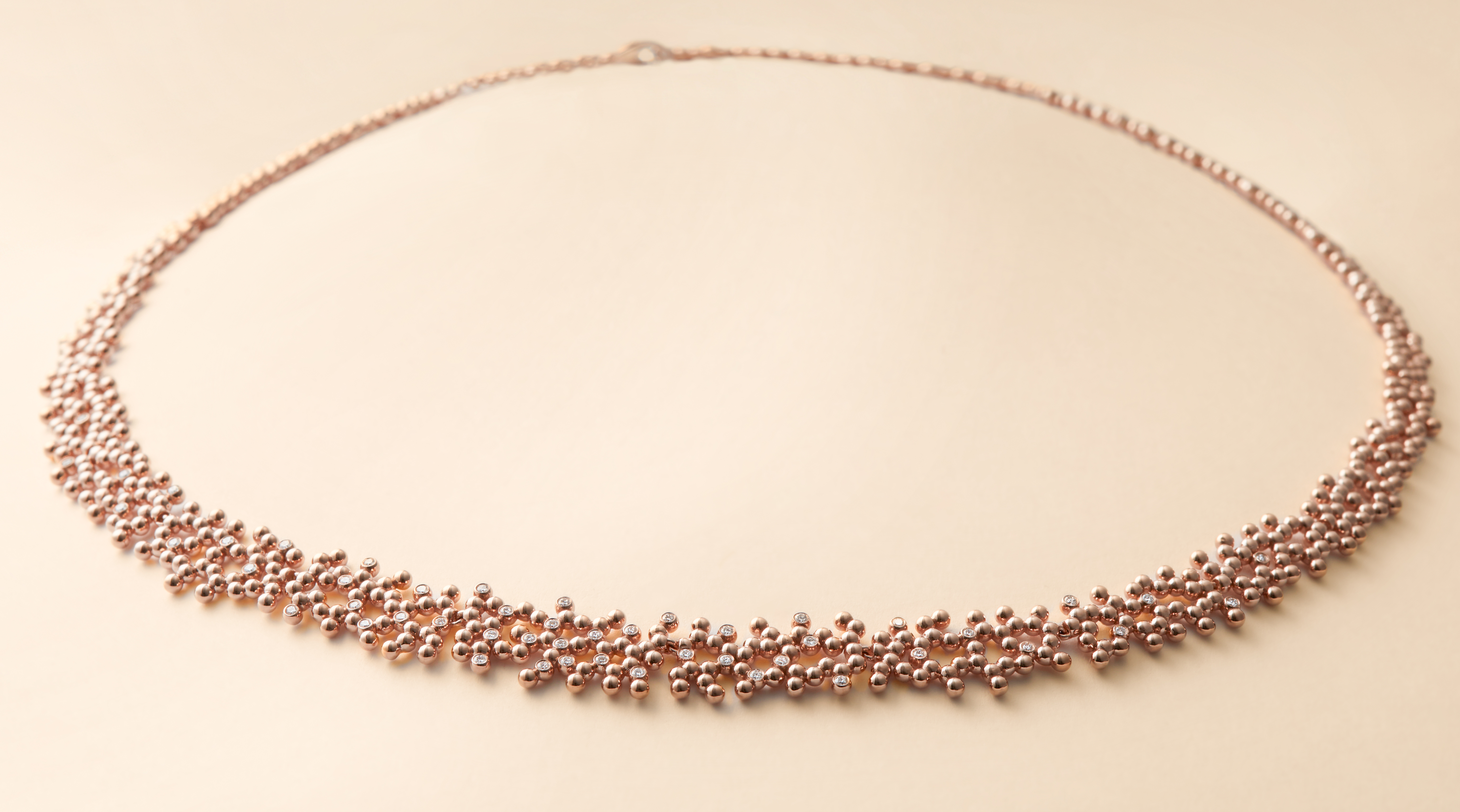 Eine neuartige, lichtdurchbrochene Struktur, die innovativ ist und gleichzeitig durch ihre Natürlichkeit sehr vertraut wirkt, schafft ein harmonisches Gesamtbild. Als Inspiration für die Kreation von AURELIA diente Timo Küchler die Natur. Die roségoldenen Kugeln sammeln sich wie Meeresschaum am Strand in der Abendsonne, alles in Bewegung, spricht die Sinne an und bietet einen taktilen Genuss. Die Kugeln verschmelzen harmonisch wie Seifenblasen und ordnen sich ganz von selbst zu einem vollendeten Schmuckstück. Diese bewusst gestaltete, natürlich-chaotische Netzstruktur ist dank neuester Technologie und innovativem Gussverfahren erst heute möglich geworden.
