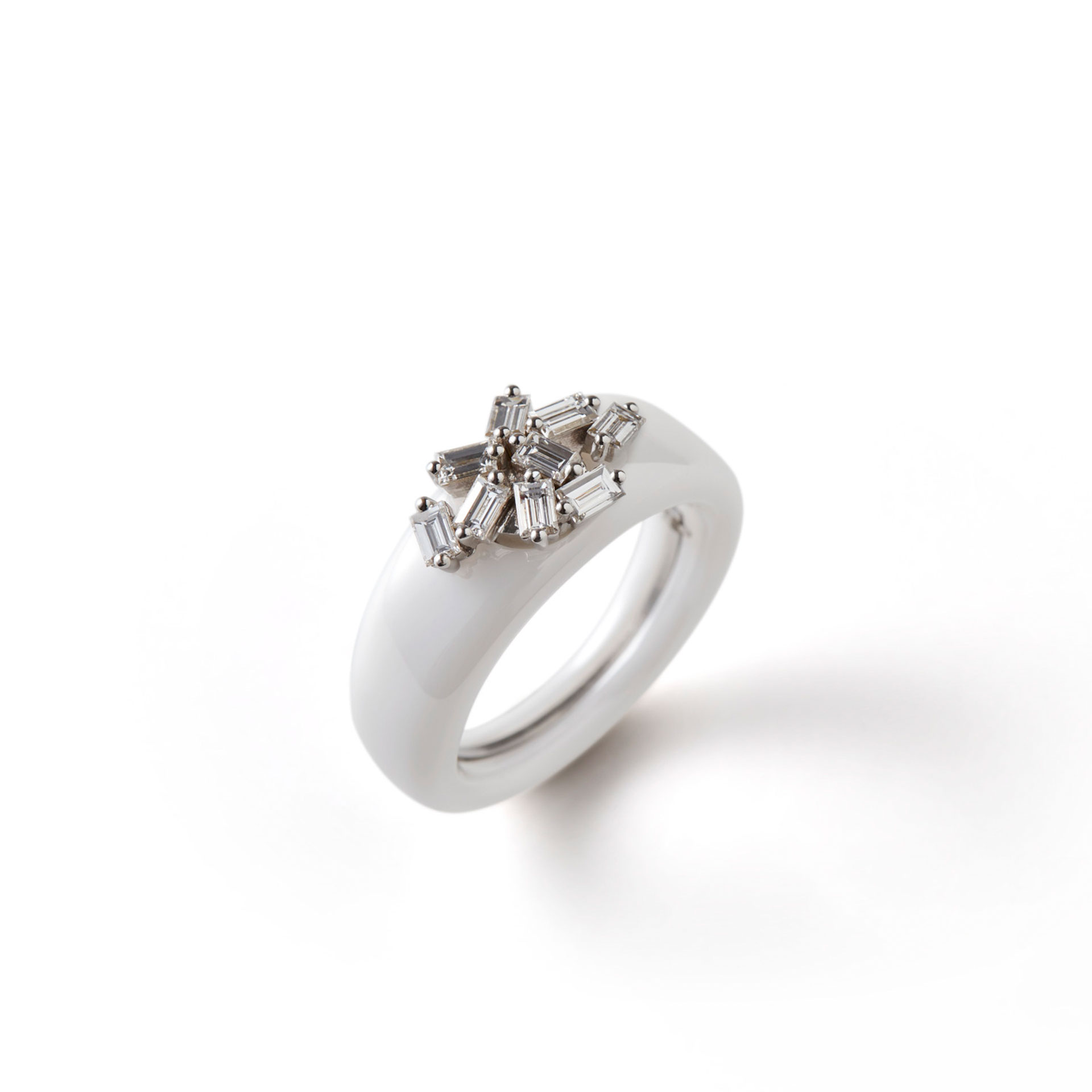 Zufall in seiner schönsten Form: Neun Diamanten im Baguette-Schliff fügen sich zu einer Anordnung, die an natürlich gewachsene Kristalle erinnert. Harmonisch im scheinbaren Chaos schmiegen sich die Fassungen an die sanft geschwungene Ringform – wie aus einer Märchenwelt - und Sie tragen die Hauptrolle.