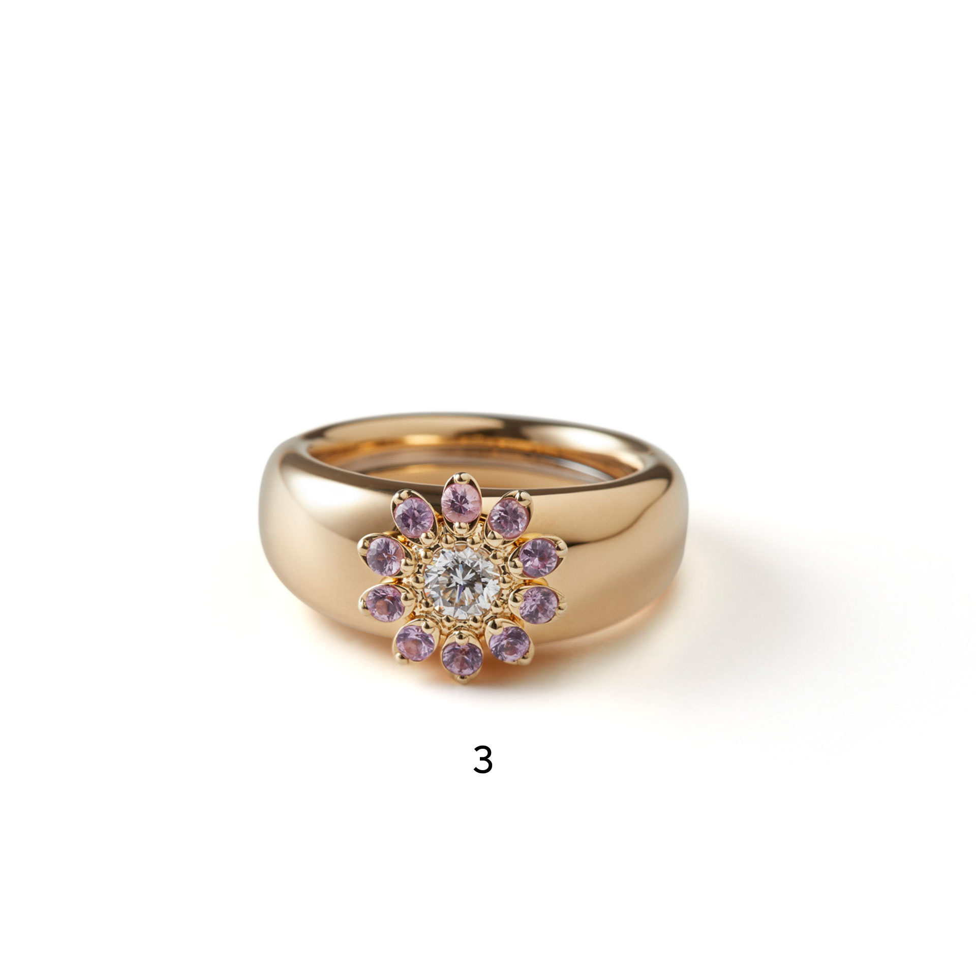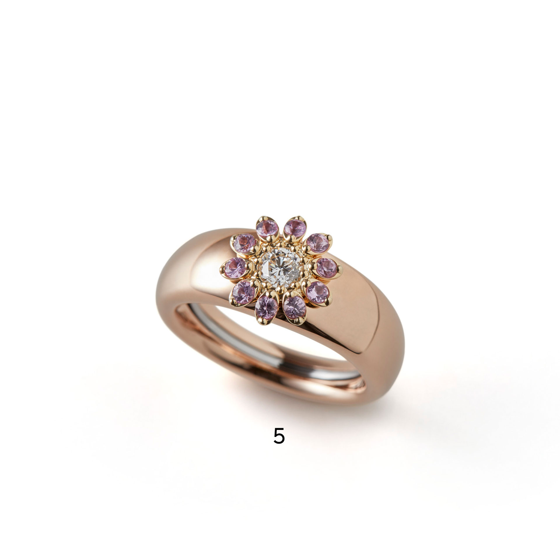 ein Viertelkaräter, umgeben von zehn Brillanten oder rosa Saphiren, gefasst