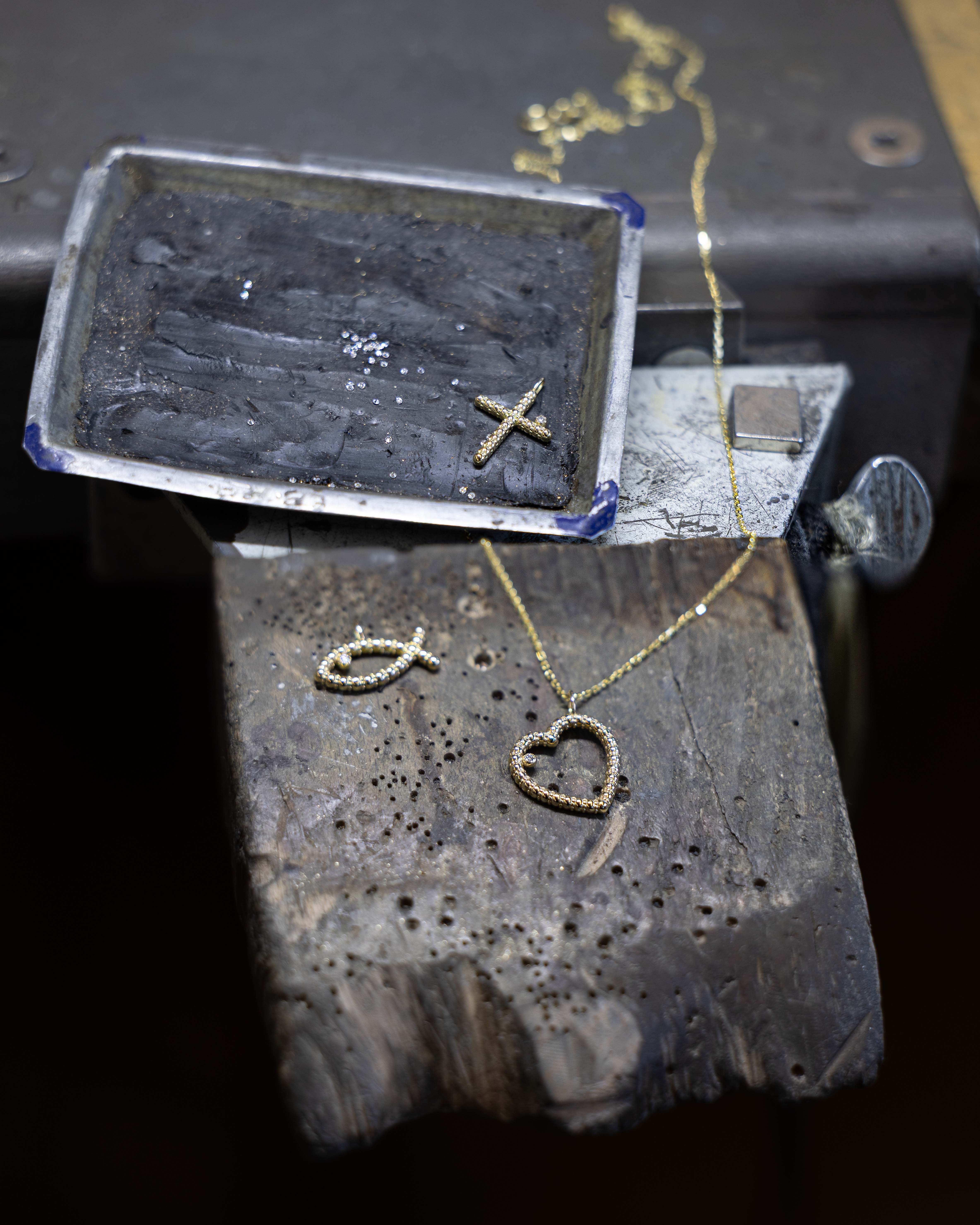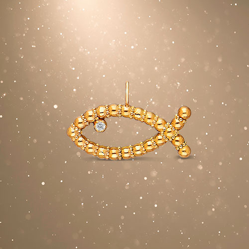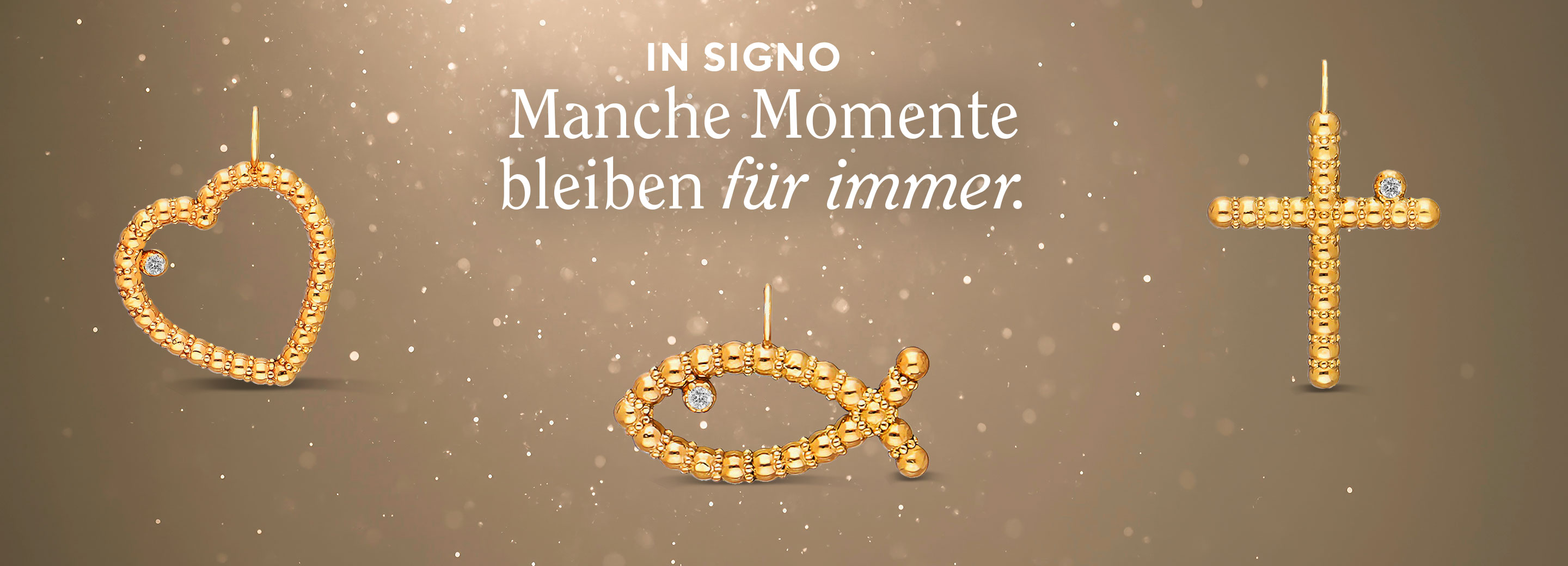 IN SIGNO geschaffen. Feinste goldene Kugeln aus 585 Gold formen zeitlose Symbole: das Kreuz, den Fisch und das Herz. Sie stehen für immerwährende Werte wie Glaube, Hoffnung, Liebe und Vertrauen und sind zugleich wundervolle Botschafter der Zuneigung.